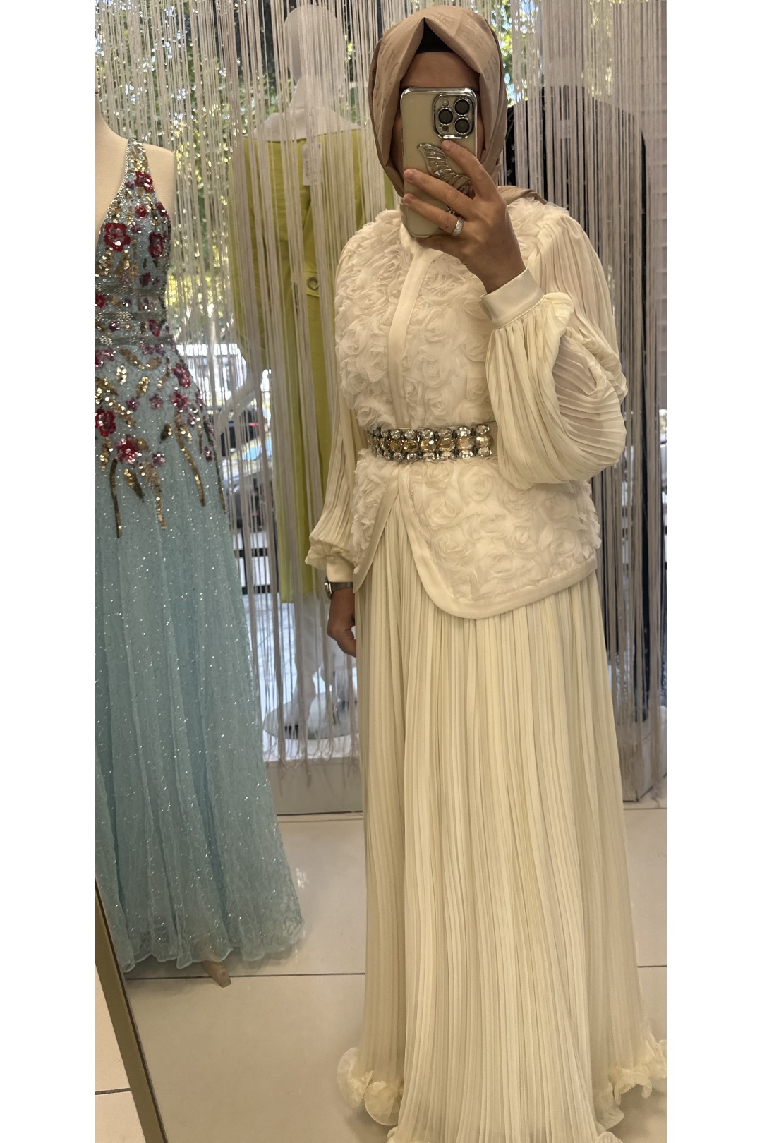 Romantik 3D çiçek işlemeli üst detayı, taş kemerle birleşerek belinizi zarifçe vurgular. Piliseli etek kısmı ise akıcı duruşuyla hem şıklığı hem de konforu bir arada sunar.