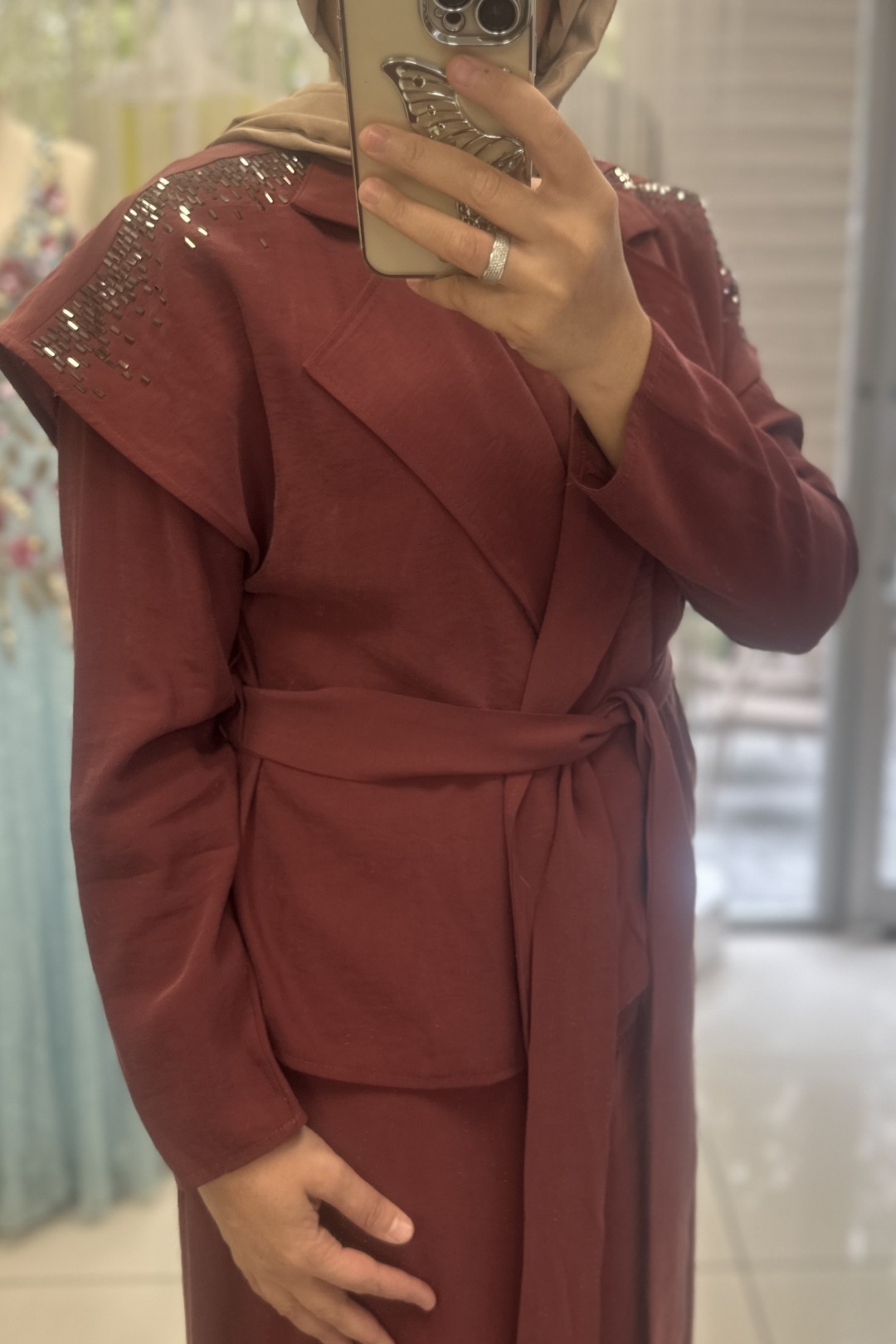 Sernisa Yelekli Taş Detaylı Tam Boy Elbise